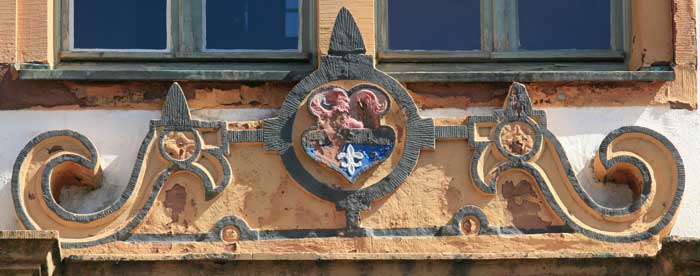 Am alten Rathaus sehen wir über einem Türsturz das Stadtwappen von Darmstadt, einen geteilten Schild, oben in Gold ein blau bewehrter und bezungter, aus der Teilungslinie wachsender, roter Löwe, unten in Blau eine silberne Lilie. Der rote Lowe mit blauer Bewehrung in Gold ist eine Erinnerung an die alten Herren der Stadt, die Grafen von Katzenellenbogen. In dieser Form wurde der Stadt Darmstadt das Wappen 1917 von Großherzog Ernst Ludwig verliehen, es hat aber wesentlich ältere Wurzeln und findet sich bereits auf einem Schlußstein des Stadtkirchenturmgewölbes aus dem 15. Jh . Häufig wird das Wappen mit einer auf den Schildrand gesetzten, goldenen und rot ausgeschlagenen großherzoglichen Krone dargestellt.