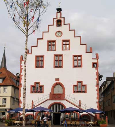 Das Kopfende des historischen Markplatzensembles bildet das historische Rathaus (Marktplatz 1), 14 m breit und 40 m tief, 1422 errichtet (Datierung in der Bauinschrift über dem Portal zum Obergeschoß). Es war nicht nur Rathaus, sondern auch Tanzhaus für die Bürgerschaft und auch Kaufhaus, denn im Erdgeschoß war eine dreischiffige Markthalle, auch die Stadtwaage war hier untergebracht, und im ersten Stock befand sich einer der bis heute größten Bürgersäle Frankens, ein Mustertyp des deutschen Rathauses mit seinen verschiedenen Funktionen. Den einzigen Zugang zum Obergeschoß bildete eine doppelläufige Freitreppe, die auf einem kleinen Podest mit Brüstung endete. Unter dem Podest war ein Raum für die Stadtwache nebst Arrestmöglichkeit. Im ersten Obergeschoß finden wir charakteristische gotische Fenster, dreiteilig mit erhöhtem Mittelfeld. darüber befinden sich zwei Reihen großer Fenster mit steinernem Fensterkreuz. An den Versammlungssaal wurde bald eine Ratsstube angebaut. Zum Marktplatz hin hat das Gebäude einen schlichten Treppengiebel. 1669 wurde die Treppe ins Obergeschoß unter Fürstbischof Johann Philipp von Schönborn (reg. 1642-1673) erneuert, aus dieser Zeit stammt das daran angebrachte Wappen. Das Wahrzeichen der Stadt Karlstadt ist das sog. "Schwedenmännle" von 1718 in der Nische ganz oben unter dem Glockentürmchen. 1976 zog die Stadtverwaltung in das neue Rathaus um.