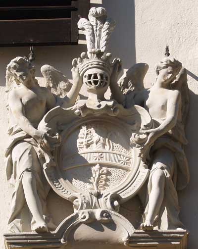 ins späte 18. Jh. zu verortende Wappen an der ehemaligen Stiftsdechantei von St. Jakob, am Jakobsplatz 14, wird über dem Tor von