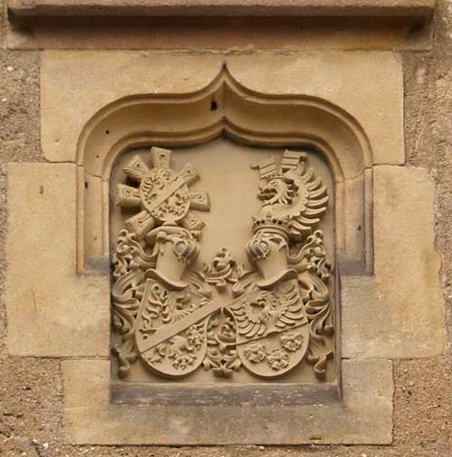 Wappen von Albrecht von Wertheim, Bamberger Bischof 1398-1421. Das Wappen ist selbstverständlich nicht original, sondern "restauriert". Es ist als zusammengestelltes Wappen dargestellt mit zwei separaten, einander zugeneigten Schilden: