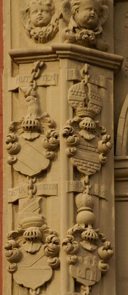 Es gibt übrigens eine nah verwandte Ahnenprobe für einen Bruder von Franz Ludwig von Hutten zum Stolzenberg: Bonifatius von Hutten zum Stolzenberg (1684-1739) wurde geistlich, trat ins Benediktiner-Stift Fulda ein, wurde Stiftskapitular und hatte 1724-1732 die Propstei Holzkirchen inne. Über dem Portal der Rundkirche von Holzkirchen (siehe dort) ist sein Wappen mit der Ahnenprobe von Hutten, von Hagen zur Motten, von Diemantstein und Ullner von Dieburg angebracht, also ein kleinerer Ausschnitt aus der hiesigen, noch umfangreicheren Ahnenprobe. Weitere heraldische Spuren hat besagter Bruder an der Propstei Thulba (siehe dort) hinterlassen, die er danach innehatte.