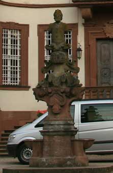 Im Hof fällt eine besondere Konstruktion auf: Auf dem Sockel des Brunnens von 1728 befindet sich eine Kartusche mit dem Hutten-Wappenschild. Die Brunnenfigur aber ist nichts anderes als ein überdimensioniertes Oberwappen. Von wegen 3:2:3 - insgesamt ist das Oberwappen viermal so hoch wie die Schildkartusche, allein das Helmgitter nähme im Vergleich den größten Teil der Schildfläche ein. Es ist ja auch gar nicht als heraldisch korrekte Wiedergabe des Familienwappens gedacht, sondern primär eine Brunnenfigur, die als pfiffiger Clou in Form des Oberwappens gestaltet ist.