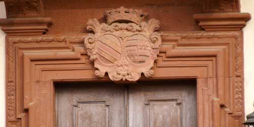 Über dem Haupteingang, zu erreichen über eine doppelläufige Freitreppe, befindet sich das Allianzwappen des Bauherrenpaares, Franz Ludwig v. Hutten zum Stolzenberg (24.8.1669 - 28.8.1728) und Johanna Juliana Freifrau v. Bicken (1682 - 21.7.1755).