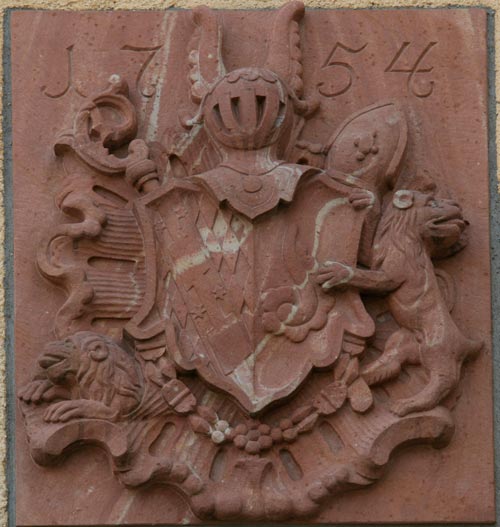 Zum direkten Vergleich das Stiftswappen St. Castulus alleine, dieses Photo wurde an der Kirche St. Martin in Landshut gemacht, wo es in moderner Ausführung zusammen mit dem Papstwappen (Basilica minor!) die Fassade neben dem Turmportal schmückt: