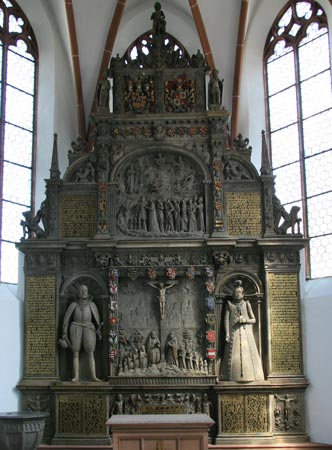 Der Chorabschluß hinter dem Altar wird bis in Höhe des Fensterabschlusses eingenommen von einem gigantischen Epitaph, das Georg I. Landgraf v. Hessen-Darmstadt (10.9.1547 - 7.2.1596) seiner ersten Frau, Magdalena Gräfin zur Lippe (24.2.1552 - 26.2.1587) errichten ließ. Der Aufbau ist in mehrere Zonen aufgeteilt. Über einer Sockelzone folgt die größte Zone, ein zentrales Relief wird von den beiden vollplastisch gearbeiteten Figuren der Eheleute flankiert, außen folgt jeweils ein Inschriftenfeld. Die nächste Zone hat ein zentrales Relieffeld, das aber direkt von den beiden nur halb so hoch reichenden Inschriftenfeldern begleitet wird, so daß hier schon die Giebelzone beginnt. Die oberste Zone hat nur noch Platz für zwei Felder für jeweils ein prächtiges Vollwappen für jeden Ehepartner. Obelisken akzentuieren die vertikalen Strukturen, kunstvolles Schmuckwerk füllt die Ecken zwischen den rechteckigen Einheiten zu einem mehr oder weniger dreieckigen Giebel.