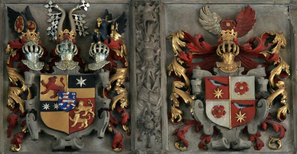 Interessant ist, daß der Schild jeweils eine relativ eng an den Vorbildern orientierte Form hat, aber einer Kartusche mit Renaissance-Rollwerk aufliegt. So erfüllt der Schild selbst die heraldischen Anforderungen einerseits durch seinen geraden Rand und die ästhetischen Vorgaben seiner Zeit andererseits durch seine Unterlage.