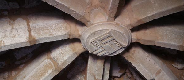 Seitlicher Blick auf den restaurierten zentralen Schlußstein in der gewölbten Halle des Wasserturmes vom Ende des 14. Jh.