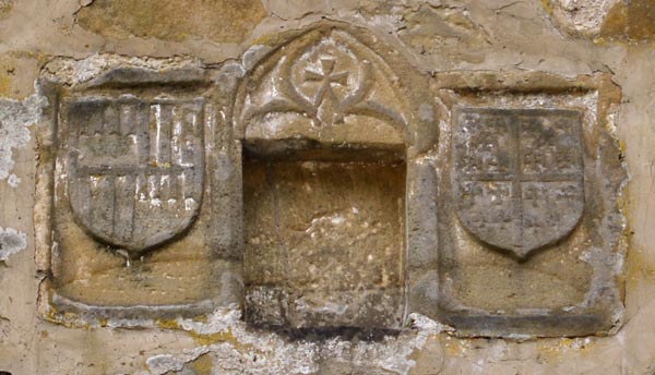 Kaminblende im Wasserturm, zwar beschädigt, doch ist das beiderseitige Beaufort-Wappen noch gut zu erkennen. Man beachte die elegante gotische Schildform mit der Oberkante aus zwei Bögen und den spitz ausgezogenen Oberecken.