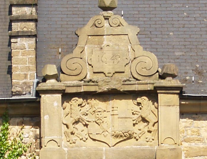 Innenseite des Hauptturmes, Doppelwappen über der Tordurchfahrt, links Orley-Beaufort in vollständig gewendeter Form, geviert von Silber und Gold, 1+4: Zwei rote Pfähle, 2+3: rotes Schildhaupt, darin ein fünflätziger silberner Turnierkragen. Heraldisch links de Boulant (Boland, Bollant, von den Herren von Houffalize abstammend) sein, in Blau ein goldenes Kreuz, bewinkelt von je 5 goldenen, widergekreuzten Kreuzchen (d'azur à la croix d'or, accompagnée de 20 croisettes recroisettées, au pied fiché du même). Jean d'Orley, Herr von Beaufort, Sohn von Guillaume d'Orley und von Elise de Wiltz, gestorben zwischen dem 28.10.1490 und dem 27.8.1491, hatte Marie de Boulant geheiratet, gestorben vor dem 14.8.1468.