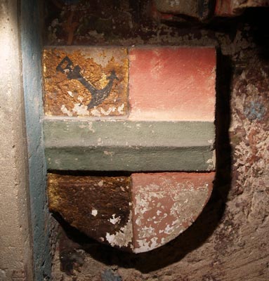 Wappen Bechtolsheim von Bechtolsheim, Stock von Bechtolsheim, Rost von Bechtolsheim: Es gibt mehrere Farbversionen bei den Bechtolsheimern: Hermann Stock von Bechtolsheim führt 1450 im Pfälzer Vasallenbuch den Schild silbern-schwarz gespalten, darüber ein roter Balken. Variante: Schild golden-schwarz gespalten, darüber ein roter Balken. Helmzier ein silberner (bzw. goldener) und ein schwarzer Flügel, jeweils mit einem roten Balken belegt. Decken rot-silbern nach Gruber. Gerhard Rost von Bechtolsheim führt 1365 den Schild golden-rot gespalten, darüber ein grüner Balken, und genau so ist der Schild auch hier am Epitaph abgebildet, dazu ist im rechten Obereck ein schwarzer Anker gemalt. Nachweise: Otto Gruber: Wappen des mittelrheinisch-moselländischen Adels, Trier 1962-1965, incl. Nachtrag Trier 1967, Zobel Tafel 21, Held S. 22. |