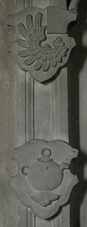 An den beiden seitlichen Pilastern befinden sich je vier Wappenschilde, optisch links für den Ehemann, optisch rechts für die Ehefrau. Die Schilde des Ehemannes sind alle nach innen gewendet, aus Courtoisie. 7 der 8 Wappen sind gut erhalten, lediglich das ganz rechts unten ist komplett verwittert.