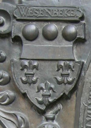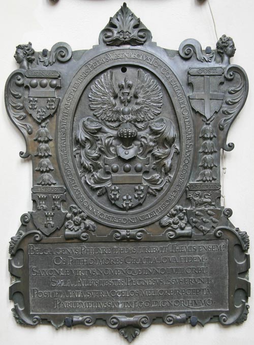 Hier finden wir ein besonders prächtiges bronzenes Denkmal, 98 cm hoch und 72 cm breit. Über dem rechteckigen Inschriftenfeld befindet sich in einem ovalen Feld mit einer zweiten umlaufenden Inschrift das Familienwappen, welches außerhalb dieses Ovalfeldes von vier Ahnenwappen in den vier Ecken begleitet wird. Die Inschrift unter dem Wappen besagt: "BELGA GENVS, PHILYRE TAEDAS TRIBVIT THEMES ENSEM: OS PITHO MORES GRATIA IOVA FIDEM SAXONIAE VIRTVS NOMENQVE INNOTVIT ORBI: SALA, ALBIS TESTES, PEGNESVS, ISSVS ERVNT POST PIA FATA SVPRA COELOS MELIORE RECEPTA PARTE MEI IVSSA VIX EGO DIGNOR HVMO". Übersetzung: Aus Belgien sein Geschlecht. Philyra gab ihm die Hochzeit, Themis gab ihm das Schwert, Pytho den Mund, Gratia die Sitten, Jehova den Glauben. Seine Fähigkeiten und sein Name wurden in der Sächsischen Welt bekannt, Saale und Elbe, Pegnitz und Issus werden Zeugen sein. Nach frommem Tod, nachdem der bessere Teil von mir nun über den Himmeln aufgenommen wurde, bin ich kaum noch würdig des mir befohlenen Grabes." Issus ist eigentlich ein Fluß namens Pinarus, der wird wohl nicht gemeint sein. Sicher ist ein weiterer Fluß des sächsischen Herrschaftsgebietets gemeint. Der Verstorbene wird in dem ovalen Schriftfeld genannt: "PETRVS WESENBECIVS I(VRIS) C(ONSVL)TVS CONSILIAR(IVS) ET ORDINAR(IVS) SAXOCOBVRGICVS OBIIT IBIDEM IN CHRISTO ANNO SALVTIS MDCIII AETATIS LVII VI KAL SEPTEMBRIS". Übersetzung: Petrus Wesenbeck, Rechtsgelehrter, Sächsisch-Coburgischer Rat und Ordinarius, starb hier in Christo im Jahre des Heils 1603 im Alter von 57 Jahren an den 6. Kalenden (eigentlich ante diem VI kalendis septembris) des Septembers. Anmerkung: Hier wird nicht das Zeichen "M" für 1000 verwendet, sondern das ebenfalls übliche Zeichen, das wie ein I aussieht, das beiderseits von zwei spiegelbildlichen C begleitet wird.