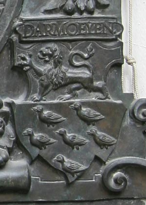 Der Wappenschild optisch links unten zeigt das Wappen Kiels, drei (2:1 gestellte) Zinnentürme. Optisch rechts unten ist der Wappenschild Darmoeyen, geteilt, oben ein schreitender Löwe, unten 6 (2:3:1) gestümmelte Vögel. Ohne Referenz, alles belgische Familien.