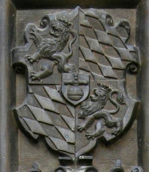 Linke Abb.: Wappenschild für Friedrich I. Pfalzgraf bei Rhein zu Simmern, Herzog v. Bayern (1417 - 29.11.1480). Der Schild ist geviert mit Herzschild: Feld 1 und 4: In Schwarz ein goldener, rot gekrönter Löwe (Pfalz), Feld 2 und 3: Von Blau und Silber eigentlich schräg geweckt, wobei die Schrägstellung hier besonders ausgeprägt ist (Wittelsbach). Normalerweise ist bei Darstellungen die Felderbelegung genau andersherum, Wittelsbach in 1 und 4 sowie Pfalz in 2 und 3. Die Pfalzgrafen bei Rhein hatten das Erztruchsessamt (Archidapifer) inne, dessen Zeichen der Herzschild ist: In Rot ein goldener Reichsapfel. 1623 wurde die pfälzische Kurwürde (Erztruchsessenamt) an die Herzöge von Bayern übertragen. 1648 bekamen die Pfalzgrafen das neu geschaffene Amt des Erzschatzmeisters (8. Kurwürde).
