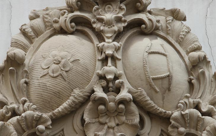 Das Wappen gehört zu Lothar Franz von und zu Guttenberg-Kirchlauter (2.3.1705-3.1.1774), Sohn von Carl Christoph von und zu Guttenberg-Kirchlauter (18.3.1659-9.5.1719) und Anna Maria Antonetta Waldbott von Bassenheim (2.3.1669-5.12.1742). Lothar Franz hatte am 28.1.1728 Maria Sophia Juliana Horneck von Weinheim (21.3.1706-9.2.1761) geheiratet, die Tochter von Freiherr Johann Philipp Horneck von Weinheim und Freiin Maria Margarethe von Eyb. Ihrer beider Sohn war Lothar Franz Gottlieb Freiherr von und zu Guttenberg-Kirchlauter (1729-1806), der am 20.1.1791 in Aschbach Christina Franziska Freiin von Pölnitz (1741-1820) zur Frau nahm.