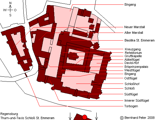 Abb.: Grundriß von Schloß St. Emmeram in Regensburg, Markierung der Position des hier besprochenen Wappens