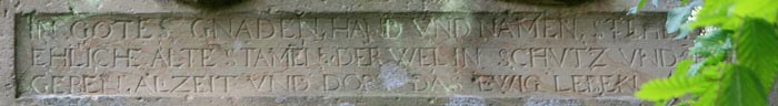 Direkt unter dem Allianzwappen befindet sich die Bauinschrift: "IN GOT(T)ES GNADEN, HAND VND NAMEN STEHE DISE / EH(E)LICHE ALTE STAM(M)EN DER WEL(LE) I(H)N(EN) SCHVTZ VND SEGE(N) / GEBEN AL(L)ZEIT VND DORT DAS EWIG LEBEN AMEN".