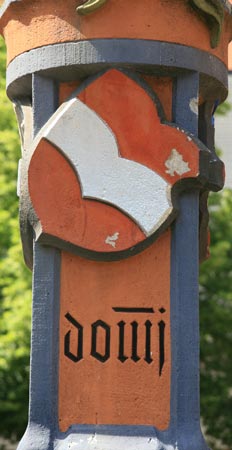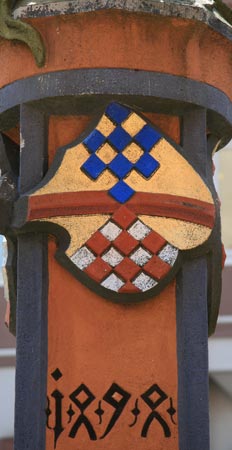 Interessanterweise sehen wir auf einer Seite das österreichische Wappen (in Rot ein silberner Balken), wobei die spitz nach unten ausgezogene Form einfach künstlerische Laune ist. Der Grund ist, daß die Mutter von Christoph I. Markgraf v. Baden (13.11.1453 - 19.4.1527, reg. 1475 - 1515), der zur Zeit der Brunnenaufstellung 1494 regierte, Katharina v. Österreich (ca. 1420 -11.9.1493) war.