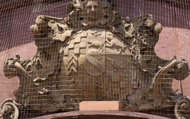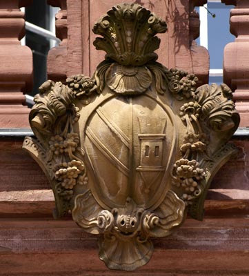 Zu diesem Wappen gehören 11 Helme (vgl. Monographie Baden). Hier ist stattdessen eine üppige barocke Umrahmung der ovalen Schildkartusche gewählt worden.