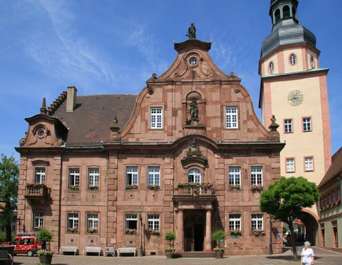Das Ettlinger Rathaus ist ein Barockbau aus regionaltypischem, rotem Sandstein. Vorangegangen waren die Verwüstungen des Pfälzer Erbfolgekrieges, die auch Ettlingen 1689 in Schutt und Asche legten. Anton Mohr war der Baumeister des 1738 errichteten Gebäudes. Nach Westen wurde der Bau 1892 neobarock aus gleichem Material erweitert, insofern ist nur der giebelgekrönte Teil authentisch. Rechts im Bild ist der Rathausturm, der eigentlich bis ins 13. Jh. das nordöstliche Stadttor war, als die Stadt noch am Ufer der Alb abschloß, aber nach der Stadterweiterung inmitten der Altstadt zu liegen kam. Als das Rathaus erbaut wurde, bekam der Turm 1737/38 als oberen Abschluß das achteckige Geschoß und den Helm in barocken Kurven.