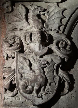 Abb. links: Wappen von Kesselstatt, in Silber ein roter Drachen. Helmzier der Drache wachsend. Helmdecken rot-silbern. Das Wappen befindet sich optisch links oben, entspricht also dem Mannesstamm des Verstorbenen bzw. dem Großvater väterlicherseits. Aufgrund seiner Position ist das Wappen komplett nach innen gewendet.