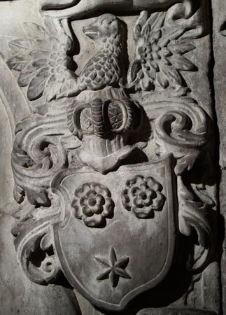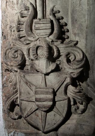 Abb. rechts: Wappen von Metternich, in Silber 3 (2:1) schwarze Jakobsmuscheln (Pilgermuscheln). Die Helmzier ist ein silberner Schwanenrumpf (Kopf und Hals) mit rotem Schnabel auf gekröntem Helm. Der Rücken des Halses kann kammartig gestaltet sein und mit schwarzen Federbüscheln besteckt - es finden sich Beispiele mit und ohne. Die Helmdecken sind schwarz-silbern. Das Wappen befindet sich optisch rechts unten, der Großmutter mütterlicherseits zuzuordnen. Beide Wappen tauchen nicht mehr am Epitaph des Sohnes auf.