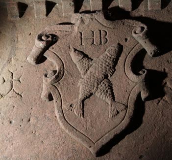 Abb.: Aufnahme der beiden unteren Einzelwappen mit Seitenblitz. Optisch links ein Schrägbalken mit Obereck, gewendet, als Helmzier ein Jagdhorn, optisch rechts ein Fingerring mit Stein, Helmzier nicht mehr erhalten. Held ordnet das Wappen mit dem Ring den von Niefern zu (S. 146).