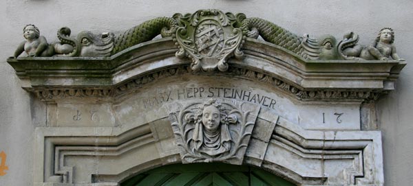 Das nachfolgend abgebildete Portal ist auf 1717 datiert. Der Eigentümer wird in der Zwischenzone genannt: Marx Hepp Steinhauer.