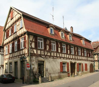Herrenbergs Altstadt präsentiert sich uns heute als einmaliges historisches Ensemble aus Bürgerbauten des 17. Jh. Dieses Handelshaus wurde im Jahre 1680 von Hans Jakob Khoenle, dem bedeutendsten Herrenberger Handelsherrn im 17. Jh., errichtet. Das Untergeschoß ist gemauert, die beiden Obergeschosse sind in Fachwerk ausgeführt. Im Scheitelpunkt des Rundbogenportals befindet sich das Wappen der Familie Khoenle, das aus einer Hausmarke besteht. Ein Vierkopfschaft, das hintere freie Ende gekreuzt, mit Mittelkreuzsprosse, der Schaft im unteren Teil heraldisch rechts zum Buchstaben "H" und heraldisch links zum Buchstaben "K" ausgezogen. Es handelt sich um ein Wappen im Grenzbereich zwischen Wappen, persönlichem heraldischen Zeichen und Hausmarke, einerseits ist durch die Gestaltung mit Vierkopfschaft etc. die Verwurzelung in einer typischen Hausmarke gegeben, andererseits sind die Initialen als Persönlichkeitsbezug in diese integriert. Die Jahreszahl wird gleich mit in den Schild aufgenommen.