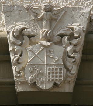 Die barocke Wappenkartusche, in der verschiedene Baumeister- und Steinhauer-Werkzeuge wie Reißlineal, Winkel, gestürzter Zirkel, Keilhaue (senkrecht nach oben gerichtet), Steinklöppel, Krönel (schräglinks gelegt) etc. sich gegenseitig überkreuzend abgebildet sind, wird auf dem mittig nach oben gebogenen Gesims beiderseits von einem Delphin begleitet, aus dessen geöffnetem Maul jeweils ein draller Putto schlüpft. Das Wappen ist ein Berufs-Wappen, denn der Beruf des Steinhauers wird durch alle möglichen Steinbearbeitungs- und Bau-Werkzeuge bildlich umgesetzt.