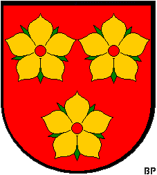 Das Stammwappen der Herzöge von Arenberg zeigt in Rot 3 (2:1) goldene Mispelblüten mit blauem Butzen (nach Gruber), auf gekröntem Helm mit rot-goldenen Decken ein oben mit Pfauenspiegeln besetztes Schirmbrett, das in Rot 3 (2:1) goldene Mispelblüten mit blauem Butzen zeigt. Varianten der Helmzier sind ein achteckiges Schirmbrett, an den freien Ecken mit Pfauenspiegeln besetzt, oder ein Pfauenstoß (vgl. Zobel, Siebmacher). Im Loutsch wird das Wappen aber beschrieben als "De gueules à 3 fleurs de neflier d'or percées du champ barbées de sinople", also keine blaue Mitte, sondern Feldfarbe. Und hier sind wir schon mittendrin in einer Diskussion, wie wir die Objekte im Schild ansprechen. Korrekt ist die Ansprache als Mispelblüte. Das ist eine fünfzählige Blüte, deren Blütenblätter nicht am Rand eingerollt sind wie bei einer Rose, sondern nach außen etwas spitz geformt sind. Im Loutsch wird ebenfalls der Ausdruck "fleur de néflier" benutzt. Dort wird beschrieben, daß sie früher ganz golden waren und später eine blaue Mitte erhielten. Alternativ findet sich die Bezeichnung "Fünfblätter", auch zutreffend. Eine ganz und gar unglückliche Übersetzung, die einige Siebmacher-Bände verwenden, ist der als "Nesselblumen". In Gent befindet sich in einer Kirche eine wunderschöne gemalte Tafel mit dem Arenbergischen Prunkwappen (Doppelwappen mit Mansfeld), dort sind die Blütenblätter golden, die Mitte rot wie die Feldfarbe, und Kelchblätter fehlen, und genau so werden idealerweise Mispelblüten dargestellt.