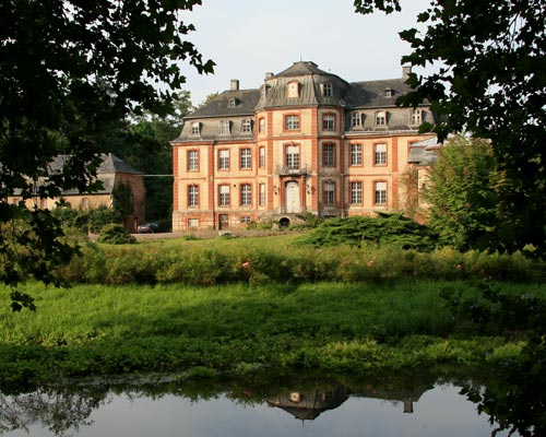 In Türnich, heute zu Kerpen gehörig, befindet sich innerhalb eines riesigen Schloßparks ein bezauberndes Rokokoschloß. Inmitten dieser grünen Oase taucht jenseits des Wassergrabens und hufeisenförmigen Sees (Nebenarme der Erft), dieses kunsthistorische Kleinod auf, wie ein Märchenschloß im Schilf, doch diesem ersten Eindruck weicht schnell Ernüchterung: Das Kleinod ist eine Ruine, seit fast 30 Jahren leerstehend aufgrund der Einsturzgefahr. Bergbau ist Segen und Fluch zugleich in dieser Region. Auch wenn dieses Wasserschloß aufgrund seiner Eleganz und verspielten Leichtigkeit im Geiste französischer Maisons de Plaisances in einem Atemzug mit anderen Schöpfungen des Rokokos in der Region wie Cuvilliés Jagdschloß Falkenlust bei Brühl genannt wird, auch wenn die wahre Einzigartigkeit das komplett (!) erhaltene Intérieur ist, so ist man doch machtlos gegenüber den Folgen der Absenkung des Grundwasserspiegels durch den benachbarten Braunkohlentagebau, denn das Schloß steht auf zwei verschiedenen Untergründen. Stählerne Zuganker verhindern seit 1980 zwar ein Auseinanderbrechen des Gebäudes, doch ganz gebannt ist die Gefahr des Einsturzes noch nicht, und der lange Leerstand sowie undichte Stellen trugen zur Sanierungsbedürftigkeit der Kostbarkeit bei. Auch heute noch ist das Schloß in Familienbesitz (Graf Godehard von und zu Hoensbroech, ALCEA GmbH), bewohnbar sind allerdings nur die Wirtschaftsgebäude der Vorburg, die ein großes Hufeisen aus drei Flügeln östlich des Herrenhauses bilden, und wo Wohnräume, Bibliothek und Schloßcafé eingerichtet sind. Das Wasserschloß wurde 1757-1766 von Freiherr Carl Ludwig von Rolshausen erbaut (Wappen: In Rot zwei schräggekreuzte und gestürzte silberne Handruder), vielleicht von dem in kurkölnischen Diensten stehenden französischen Architekten Michael Leveilly. Die von Rolshausen veräußerten es aber nach noch nicht einmal 100 Jahren. Käufer waren 1850 die Grafen von und zu Hoensbroech (van Hoensbroeck, ein in der Region Limburg und am Niederrhein ansässiges Adelsgeschlecht). Die nahe Braunkohlegrube machte die neuen Besitzer erst wohlhabend und seit 1974 an den Folgen verzweifelnd. Kleinere Umbauarbeiten erfolgten um 1890 durch Reichsgraf und Marquis Franz-Eugen von und zu Hoensbroech. 1895 wurde eine neoromanisch ausgestattete Kapelle angebaut. 2009 wurde das Dach erneuert; die Schiefereindeckung ist in Arbeit. Mittlerweile hat das Schloß auch eine neue Fassade und ist weiß gestrichen. Maßnahmen zur Sicherung der Statik erfolgten. Außerdem wurde der durch das undichte Dach wuchernde Hausschwamm bekämpft. Allein es fehlt noch ein Nutzungskonzept und die Finanzierung weiterer Maßnahmen. Ob sich das Schloß in Zukunft mit vertretbarem Aufwand bewahren oder gar retten läßt, ist völlig offen. Es ist eines der meisten bedrohten Kunstdenkmäler der Region.