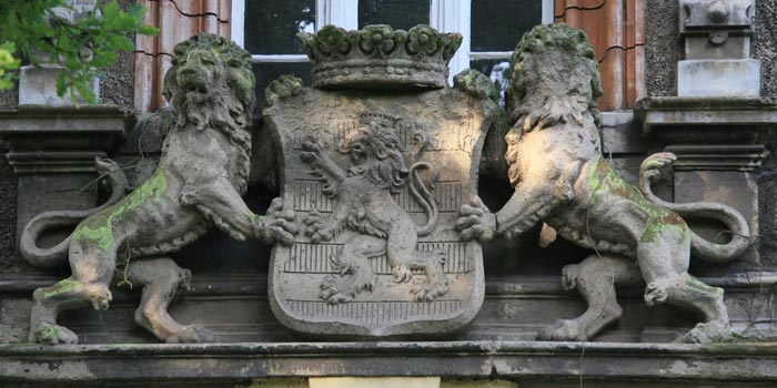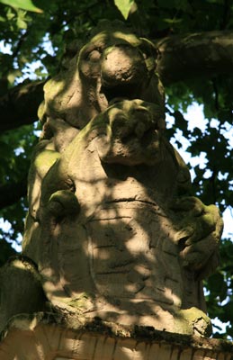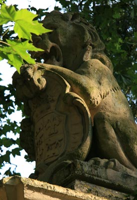 Zwei schildhaltende Löwen am Eingang zum Schloßpark. Der in der linken Abbildung hält einen Schild mit dem Wappen Hoensbroech wie beschrieben, der in der rechten Abbildung hält einen Schild mit dem vermehrten Wappen Wolff-Metternich, geviert: Feld 1 und 4: geteilt, oben in Blau ein silberner, dreilätziger Turnierkragen, unten in Silber ein natürlicher Wolf, einwärts laufend (Stammwappen). Hier eine Variante, wo der Schildinhalt auch vertikal umgestellt wird, so daß der Turnierkragen in Feld 4 unter dem Wolf zu liegen kommt, heraldisch nicht einwandfrei. Feld 2 und 3: in Gold eine rote Lilie, auf jedem der oberen Seitenblätter ein grüner linksgewendeter Sittich (Vogel) sitzend (v. Elmpt). Zwei hier nicht abgebildete Helme gehören zu diesem Wappen: Helm 1 (rechts): Auf dem gekrönten Helm mit blau-silbernen Decken ein wachsender natürlicher Wolf (Stammkleinod). Helm 2 (links): Auf dem gekrönten Helm mit rot-goldenen Decken zwischen zwei goldenen Büffelhörnern eine rote Lilie, auf jedem der oberen Seitenblätter ein grüner, linksgewendeter Sittich (Vogel) sitzend (Kleinod Elmpt).
