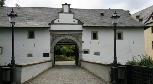 Eine einbogige Zugangsbrücke mit beiderseitiger Brüstung, aus Bruchsteinen gemauert, führt von Nordosten in den Hof der Vorburg, eine zweite, dreibogige, ansteigende Brücke vom Hof der Vorburg nach Nordwesten auf die Insel des Hauptbaus. Auch wenn diese Brücke heute in Stein ausgeführt ist, kann man noch deutlich den Falz des Anschlages der Zugbrücke erkennen nebst zwei Rollenlöchern für deren Kettenzüge. Noch weiter im Südosten schließen sich neuere Gebäude an.
