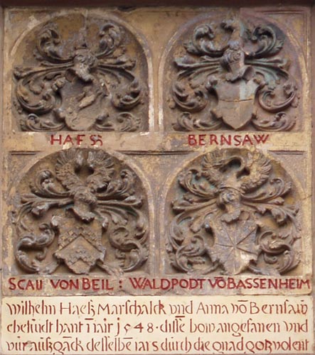 Die Inschrift lautet: "Wilhelm Haeß Marschalck (kölnischer Marschall) und Anna vo(n) Bernsaw, eheleudt (Eheleute) hant (haben) i(m) iair (Jahr) 1548 disse (diesen) bow (Bau) angefan(g)en und vur (vor) außga(n)ck (Ausgang) desselbe(n) iars (Jahres) durch die gnad(e) gotz (Gottes) volent (vollendet)."