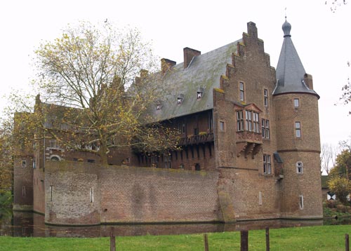 Konradsheim ist heute ein Stadtteil von Erftstadt im Rhein-Erft-Kreis. Die in Backstein ausgeführte Wasserburg befindet sich östlich der Straße von Erftstadt nach Gymnich am Rande einer Golfanlage. Das in Privatbesitz befindliche Schloß, eine Anlage auf regelmäßig quadratischem Grundriß mit vier runden Ecktürmen, Haupthaus an der Südseite mit Treppengiebeln im Westen und im Osten und Torbau an der Ostseite, ist unbewohnt und wird von den Eignern als "Eventburg" für besondere Anlässe vermietet. Der Nordwestturm bildete einst das Eck, ist aber auf Brüstungsniveau gekürzt, so daß heute dort eine Terrasse freien Blick gewährt, wo einst höhere Mauern waren. Die Wasserburg im heutigen Zustand ist das Ergebnis umfangreicher Restaurierungsarbeiten durch die Familie Neisse, die seit 1967 Eigentümer des Burghofes und seit 1976 auch der Burg ist. Die Erbauer der 1337 erstmalig urkundlich erwähnten Burg waren die Herren von Buschfeld (Arnold von Buschfeld war Küchenmeister des Erzbischofs von Köln), danach ging die Burg durch viele verschiedene Hände. Im 19. Jh. war sie baufällig, u. a. war der im Photo rechts zu sehende Turm kollabiert, wie man auf alten Ansichten sehen kann.