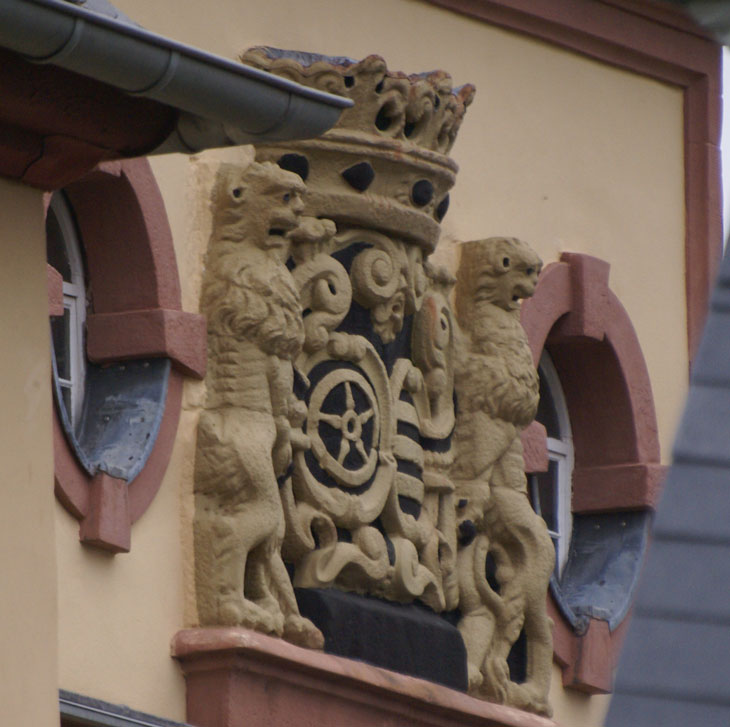Abb.: Ehewappen im Giebel über der Hauptfassade des Herrenhauses, Syberg/Pallandt.