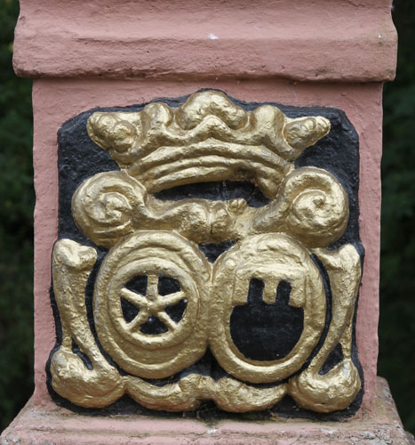 Abb. links: Brückenfigur der Brücke über den Bruchbach, auf 1736 datiert. Abb. rechts: Allianzwappen auf dem Sockel, Syberg/Harff.