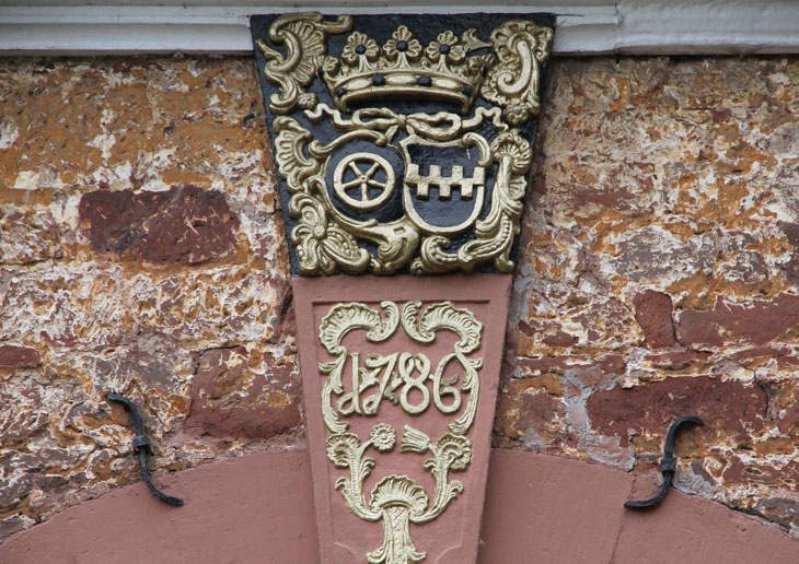Abb.: Wappenstein über der westlichen Tordurchfahrt in die Vorburg, Datierung auf 1786 auf dem Keilstein.