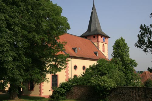 Die Wurzeln des heutigen Ensembles aus Schloß und Kirche liegen im einem alten Wehrkirchhof, der aus kirchlichem Besitz 1477 an die Grafen von Erbach kam und erst zur Burg und dann zum Schloß ausgebaut wurde. Die Kirche liegt leicht erhöht hinter dem Alten Schloß innerhalb des einst ummauerten Wehrbezirkes. Aus der späten Gotik stammt noch der dreigeschossige Kirchturm von 1479 (lt. einer Inschrift von Georg Schenk von Erbach erbaut) mit Spitzhelm über einem ehemaligen Zinnenkranz, der durch die Aufsattelung verdeckt wird; das Kirchenschiff jedoch ist Ergebnis eines spätbarocken Umbaus der Anlage und ist ein dreiseitig geschlossener Saal mit Flachdecke und Empore.