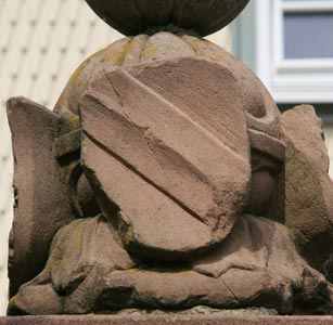 Abb. links: Wappen der Grafen von Wertheim, geviert: Feld 1 und 4: Grafen von Wertheim, geteilt, oben in Gold ein schwarzer aus der Teilung hervorkommender Adler, unten in Blau 3 (2:1) silberne Rosen mit goldenem Butzen. Feld 2 und 3: Herrschaft Breuberg, in Silber zwei rote Balken. Abb. rechts: Wappen der Markgrafen von Baden, in Gold ein roter Schrägbalken. Die Mutter von Georg II. Graf v. Erbach (18.1.1506 - 27.8.1569) war Maria v. Wertheim (geb. 23.2.1485), und die Mutter von Georgs Frau, Elisabeth Pfalzgräfin bei Rhein zu Simmern (13.2.1520 - 18.2.1564), war Beatrix v. Baden (22.1.1492 - 4.4.1535). So ist der Brunnen insgesamt eine Ahnenprobe; die beiden zugehörigen Väter waren Eberhard XI. Graf v. Erbach (22.4.1475 - 1539) sowie Johann II. Pfalzgraf bei Rhein zu Simmern, Herzog v. Bayern (21.3.1492 - 18.5.1557).