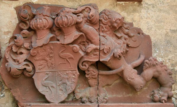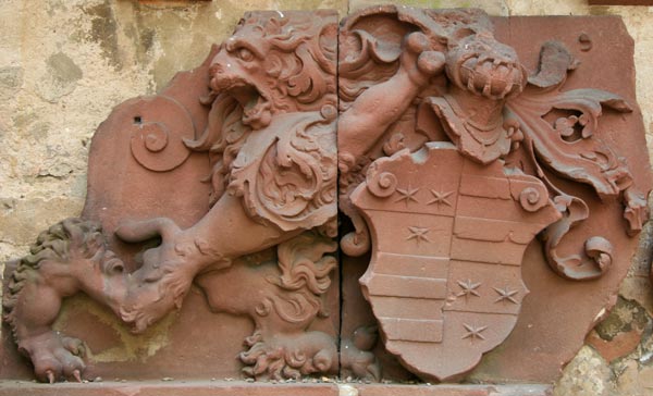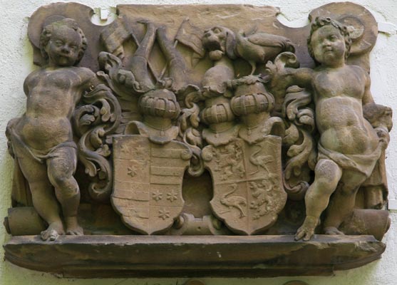 Im Hof des Alten Schlosses finden wir unter dem hofseitigen, in der Mitte des Hocherdgeschosses auf drei dreifach profilierten Konsolen ruhenden Erker des Ostflügels aufgestellt zwei herrliche Renaissance-Wappensteine von besonders herausragender künstlerischer Qualität und aufregend dynamischer Plastizität. Die Steine stammen von einem 1590 errichteten und 1809 abgebrochenen Tor und wurden hierhin gerettet, als die Verbindung zwischen den einzelnen Baugruppen geöffnet wurde.