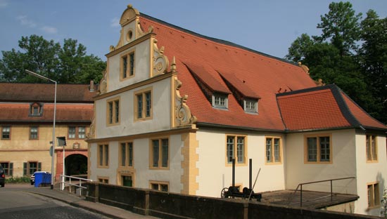 Abb.: Blick auf die zweigeschossige Schloßmühle im Südosten außerhalb der Anlage mit breitem Stufengiebel und Beschlagwerkszwickeln. Links dahinter die südliche Vorburg mit Zufahrtstorbogen.