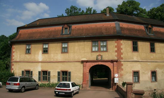 Schloß Fürstenau in der Flußaue der Mümling im Stadtteil Steinbach von Michelstadt ist ein hauptsächlich während der Renaissance auf der Basis einer spätmittelalterlichen Burg vom Kastelltyp ausgebautes Schloß der Grafen von Erbach, das in der Mitte des 14. Jh. durch Verpfändung von Mainz an die Grafen von Erbach kam und auch heute noch der Familie gehört und von ihr bewohnt wird. Eine freie Besichtigung des Schloßhofes ist zwar möglich, aber an bestimmte Zeiten gebunden, und das Innere ist strikt privat. Das Schloß besteht aus mehreren Baugruppen: Im Nordosten befindet sich die alte mittelalterliche Kernburg, das mit vier Ecktürmen bewehrte, dreiflügelige und vierstöckige Herrenhaus, welches sich mit einem Hof trapezförmigen Grundrisses nach Westen öffnet. Im Hof stehen zwei polygonale Treppentürme, mehr oder weniger in den Bau integriert. Der Bauschmuck entstammt späteren Umbauphasen, desgleichen die vergrößerten Fenster. An den Alten Bau (Mainzer Schloß) schließt im Nordwesten die innere Vorburg (Neues Palais im Westen und Beschließerei im Norden) an. Beide Bereiche trennt der gewaltige Renaissance-Schwibbogen. Im Süden erstreckt sich hufeisenförmig um ein weitläufiges, baumbestandenes Areal die äußere Vorburg mit Marstall und Neuem Bau. Diese räumlichen und funktionellen Einheiten wurden durch Wassergräben vom Umfeld und voneinander getrennt. Außerhalb der südlichen Vorburg steht die Schloßmühle, jenseits des Flusses ein weiteres barockes Gebäude. Die wesentlichen Bauphasen sind 14. Jh. (Wasserburg), eine Erneuerung in der Mitte des 15. Jh. unter Graf Philipp I. und noch einmal um 1500 unter Graf Eberhard XI, dann der weitere Ausbau unter Georg II in den Jahren 1528 und 1542, zuletzt erfolgte unter Georg III um 1588/90 der Renaissance-Ausbau mit dem riesigen Schwibbogen, der als Ersatz für die alte westliche Ringmauer geschaffen wurde.