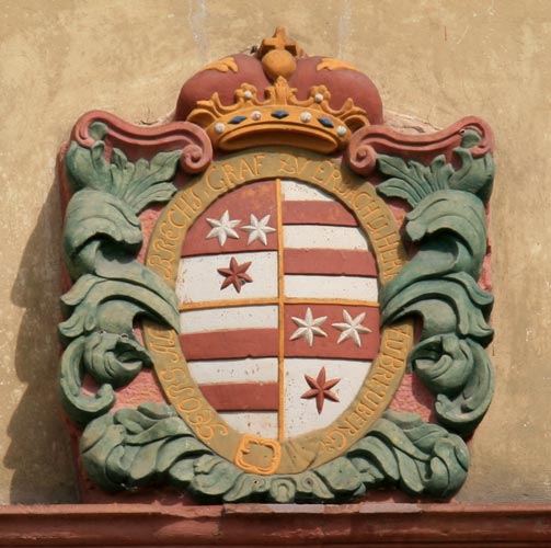 Das Wappen ist hier ohne Helm und Helmzier abgebildet. Dafür haben wir hier auf deutschem Boden und insbesondere im Odenwaldraum eine große Besonderheit, die Anordnung des Schriftbandes auf einem umlaufenden Gürtel mit Schnalle, was in der englischen Heraldik viel verbreiteter ist als in der deutschen. Die Inschrift nennt Georg Albrecht III Graf zu Erbach Herr zu Breuberg (1648-1717). Die barocke Ovalkartusche wird von grüngestrichenen Arabesken eingerahmt und von einem Fürstenhut bekrönt.