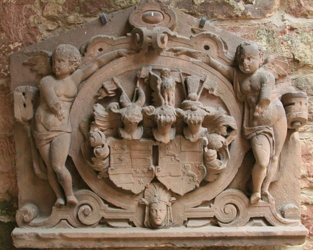 Dieser Wappenstein mit einem von zwei Putten flankierten Ehewappen ist innen am Ostflügel der südlichen Vorburg zu finden (Stallbau). Der Wappenschild der Grafen von Erbach auf der heraldisch rechten Seite entspricht der seit der Breuberg-Erbschaft 1556 üblichen gevierten Form und ist Georg III. Graf zu Erbach (15.7.1548 - 1605) zuzurechnen: