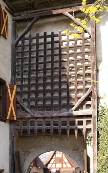 Linke Abb.: Detail des Fürstenbaues mit anstoßendem östlichem Wehrgang. Man beachte, daß alle Fensterläden in den Oettinger Farben Rot und Gold gestrichen sind und auch das Schragenmotiv aufgreifen, wenngleich diese Farbkombination nicht dem Schildbild entspricht. Rechte Abb.: Detail des hölzernen Fallgatters am oberen (inneren) Tor.