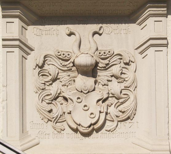 Laut Inschrift handelt es sich um "Volperth (Volpert) von Schwalbach, Land Comenthur (Landkomtur) der Baley Franckhen (Ballei Franken), Comenthur (Komtur) zu Ellingen und Nürenberg (Nürnberg) Teutsch Ordens (Mitglied des Deutschen Ordens)", der "Anno 1571 diser baw von grund angefangen (im Jahre 1571 diesen Bau von Grund auf neu erbaut hat)". Ausgesprochen schön an diesem Wappenstein ist die perspektivische Scheinarchitektur zu beiden Seiten des Vollwappens, die erheblich mehr räumliche Tiefe suggeriert als der Stein tatsächlich besitzt.