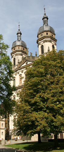 Die Klosterkirche Mariae Himmelfahrt, eine dreischiffige Hallenkirche, wurde 1707-1736 erbaut unter Abt Benedikt Knittel, im Amt 1683-1732. Der Entwurf stammt von Johann Leonhard Dientzenhofer, der noch vor der Grundsteinlegung 1708 verstarb. Erst wird Jakob Ströhlein 1708-1711 Bauleiter, nach dessen Tod 1711-1724 Bernhard Schießer. Für 1710-1712 sind Zimmerarbeiten durch Joseph Greissing beim Abschluß der Türme und beim Dach des Langhauses gesichert. Vermutlich hat Greissing erheblichen Einfluß auf die Gestaltung der Turmabschlüsse genommen, denn die Formen der Glockengeschosse und der Kuppeln, die jeweils auf einer Attika ruhen, sind absolut charakteristisch für Greissings Stil. Das Langhaus steht 1712 im Rohbau, 1722 beginnen die Arbeiten am Chor, und 1724 geht man an die Kuppel, allerdings mit einer schweren Panne, denn sie stürzt mit allen vier tragenden Pfeilern ein. Bernhard Schießer muß gehen, und seine Nachfolger Mathes und Johannes Zobel vollenden den Bau mit einer erheblich leichteren Kuppelkonstruktion. 1736 schließlich konnte die neue Klosterkirche geweiht werden. Die Fertigstellung hat Knittel nicht mehr erlebt. Heute ist sie nicht mehr Klosterkirche, da der Konvent bei der Säkularisierung aufgelöst wurde, sondern seit 1807 die kath. Pfarrkirche St Joseph. Über einem relativ hohen Sockel ist die Fassade dreigeschossig, alle Zonen sind durch kräftige Simse getrennt. Jede Zone weist zwei Statuennischen zwischen drei Fenstern auf, das mittlere Fenster in den beiden oberen Zonen jeweils mit einer kleinen Steinbrüstung. Die Nischen enthalten Statuen von Benedikt und Bernhard in der untersten Zone (siehe Bild links unten), Josef und Andreas darüber in der mittleren Zone (siehe Bild links unten) sowie Maria und Johannes d. Täufer in der dritten Zone (ohne Detailbild). Die Säulenordnung steigert sich klassisch von unten nach oben: Dorisch, ionisch und korinthisch. Über allem befindet sich ein flacher Dreiecksgiebel zwischen den beiden Türmen. Eine solche hohe und repräsentative Doppelturmfassade ist übrigens eher untypisch für zisterziensische Baukunst.