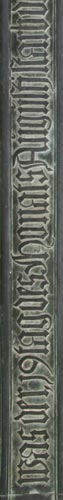 Abb.: Details, zentraler Schild des Vollwappens (in Silber zwei rotgezungte, schwarze Leoparden), rechts und links die beiden ersten Abschnitte des umlaufenden Schriftbandes.